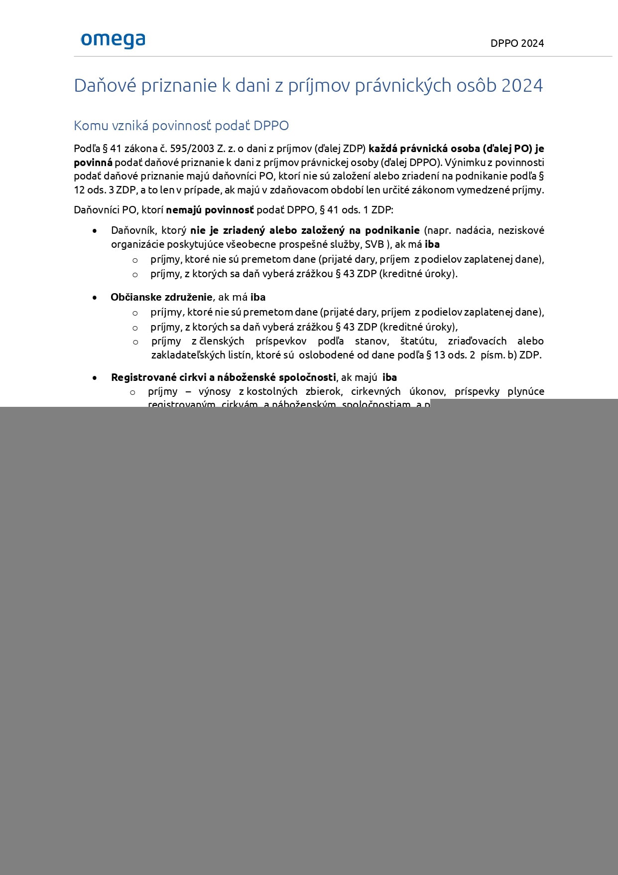 Podávate daňové priznanie k dani z príjmov právnických osôb po prvýkrát, alebo máte skúsenosti s účtovníctvom už niekoľko rokov? V oboch prípadoch určite oceníte praktického sprievodcu, ktorý vám krok za krokom vysvetlí všetko, čo potrebujete vedieť. Pripravili sme pre vás ebook „Daňové priznanie k dani z príjmov právnických osôb 2024.“ Nájdete v ňom podrobné informácie o pripočítateľných a odpočítateľných položkách, majetku, daňových stratách, minimálnej dani a mnoho ďalšieho. A aby to bolo ešte jednoduchšie, súčasťou ebooku sú aj praktické príklady z praxe. S naším ebookom zvládnete podanie DPPO za rok 2024 bez stresu a s istotou, že ste nezabudli na žiadny detail.