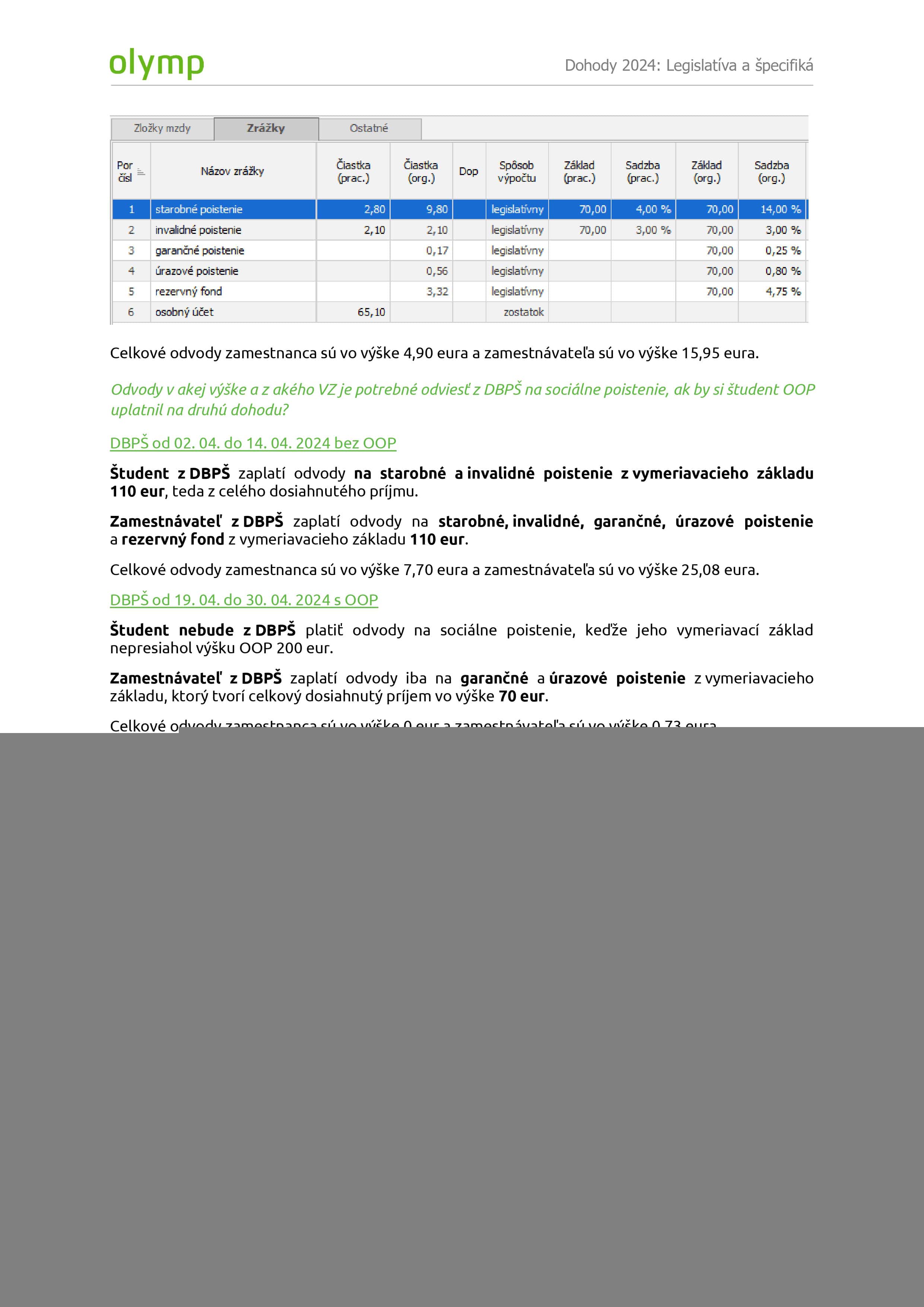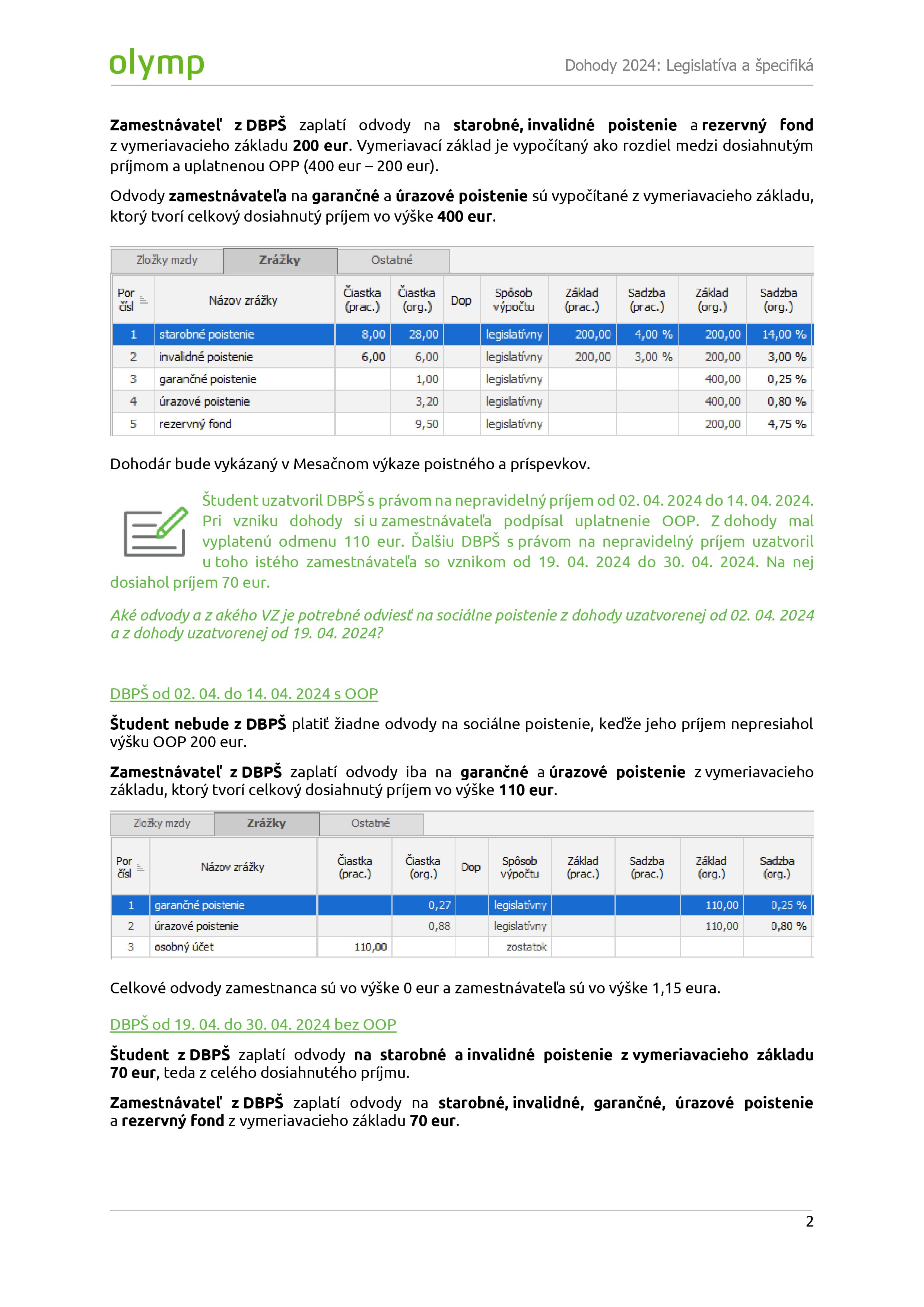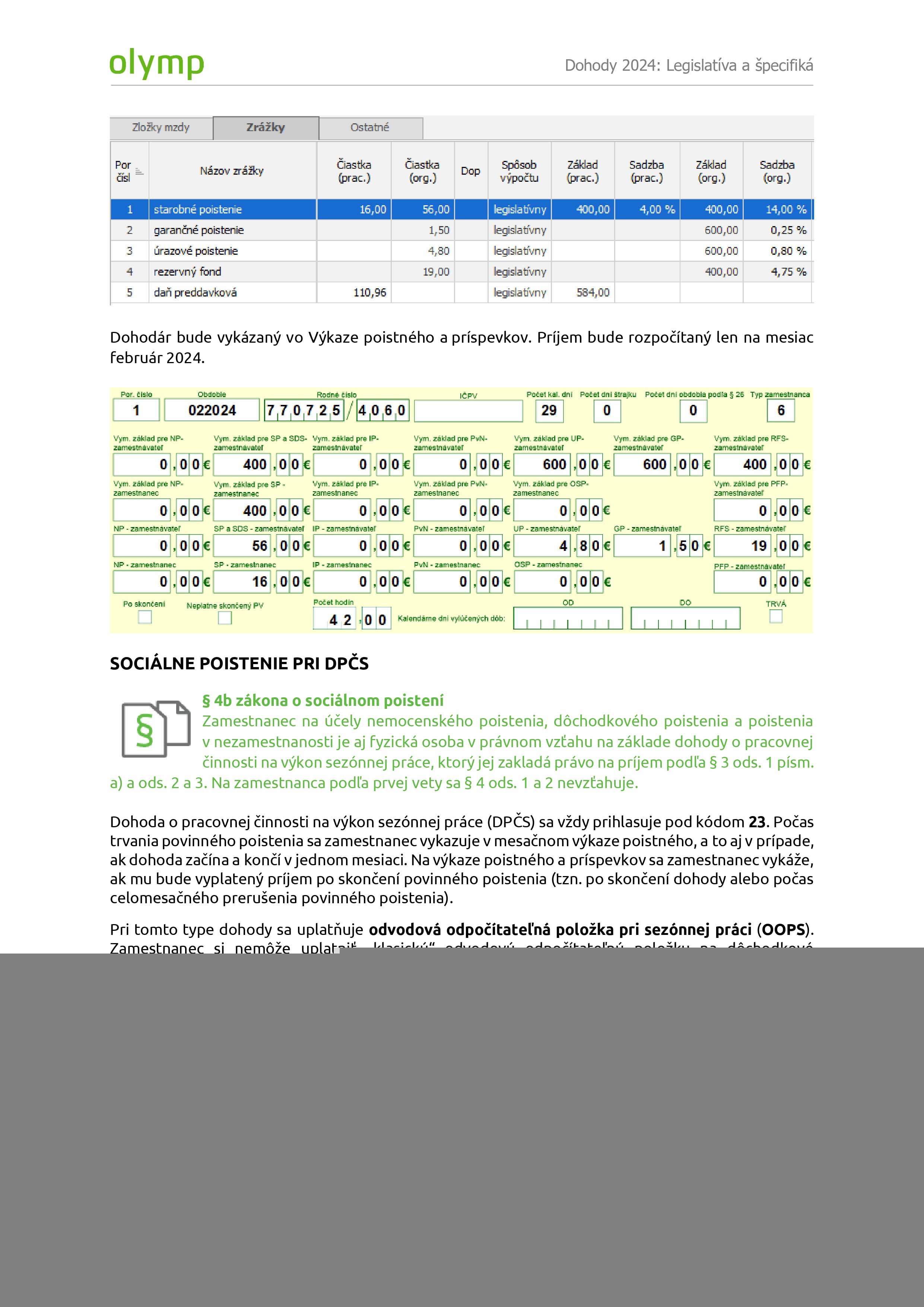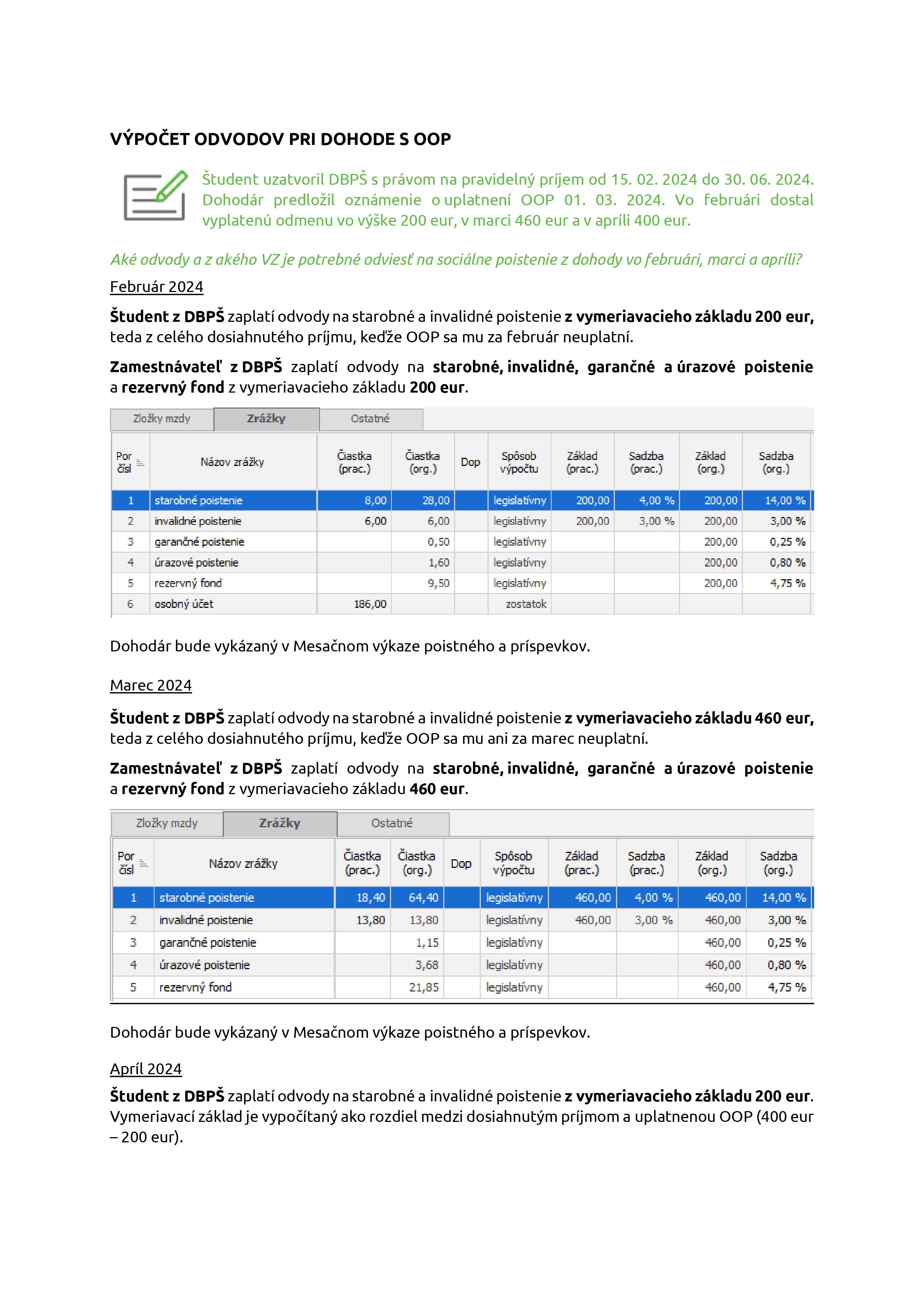 V e-booku je viacero príkladov. Aký vplyv má uplatnenie odvodovej odpočítateľnej položky na výpočet mzdy a kto si ju môže uplatniť? Aký je rozdiel medzi dohodou uzatvorenou s právom na pravidelný a nepravidelný príjem? Môžu mať dohodári úľavy na poistnom na zdravotné alebo sociálne poistenie? Kedy dochádza k rozpočítavaniu príjmov a ako sa vypočíta mzda pri dohode o pracovnej činnosti na výkon sezónnej práce? Na príkladoch sú vysvetlené nielen tieto otázky, ale aj ďalšie, s ktorými sa môžete najčastejšie stretnúť v praxi.