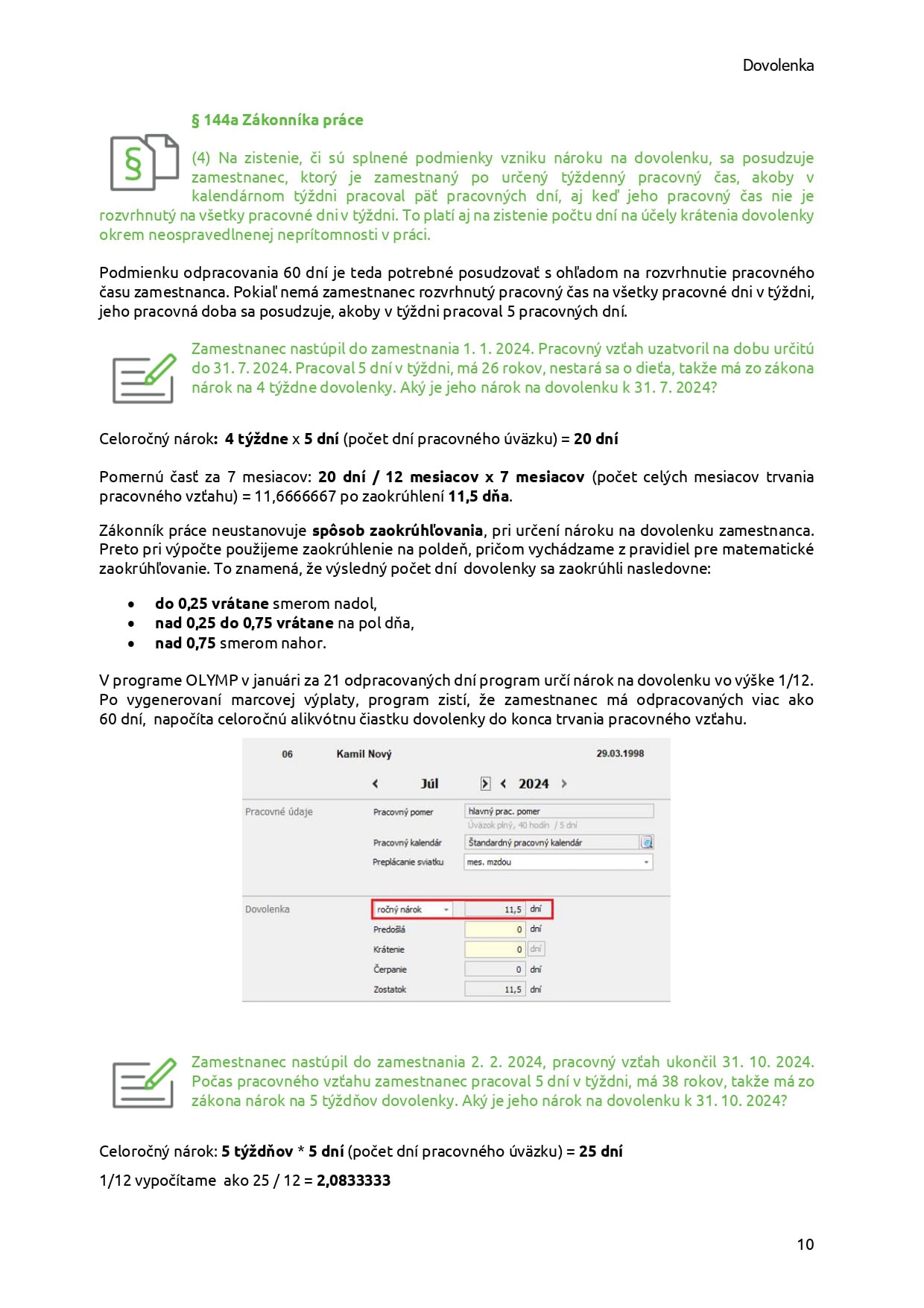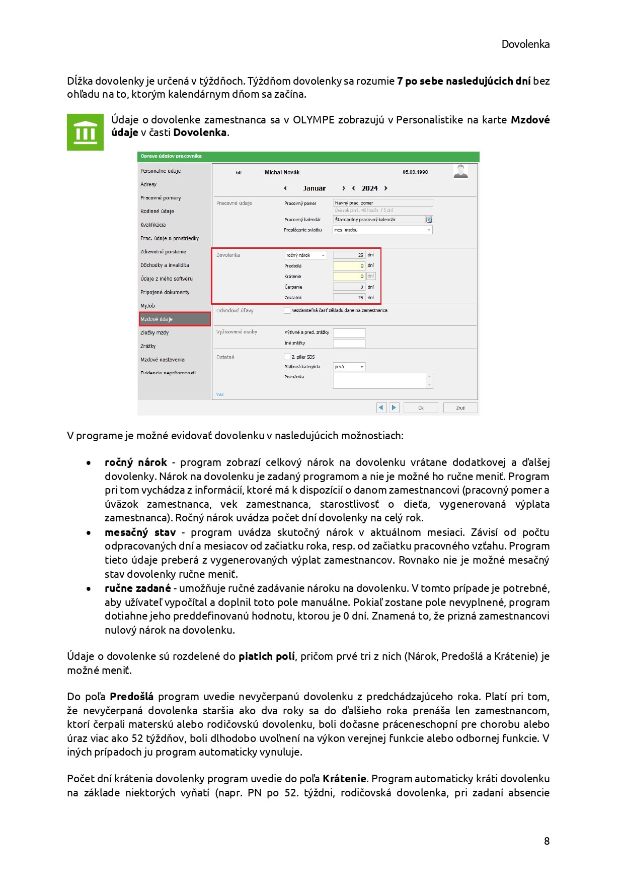 Aktualizovaný e-book vám pomôže zorientovať sa v problematike dovoleniek z pohľadu legislatívy a jej uplatnenia v praxi. Dozviete sa o nároku na dovolenku, priemere na dovolenku, plánovaní, čerpaní a krátení dovolenky. E-book je doplnený o novú podkapitolu Nárok na dovolenku pri starostlivosti o dieťa. Ukážeme vám, ako získané informácie efektívne využiť v programe OLYMP. Zoznámite sa s rôznymi pomocnými funkciami pre plánovanie a čerpanie dovoleniek. Súčasťou e-booku sú aj ukážky tlačových zostáv, ktoré môžete v súvislosti s dovolenkou používať, a množstvo praktických príkladov, ktoré vám pomôžu lepšie pochopiť túto problematiku.