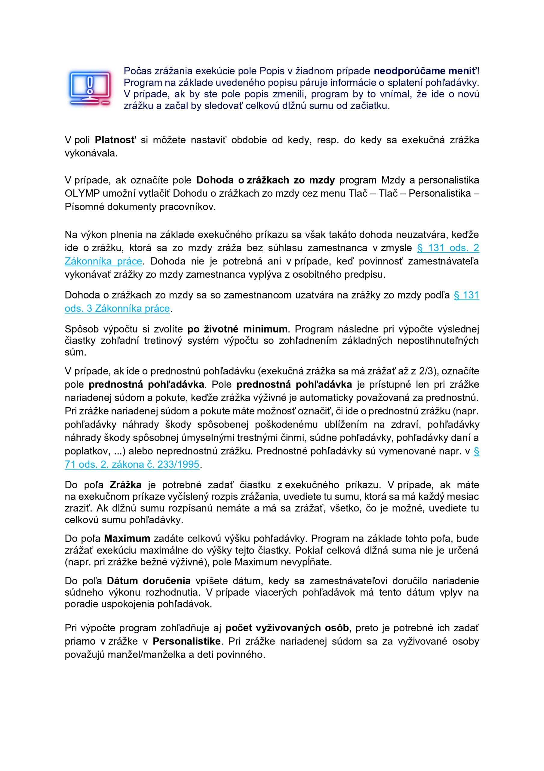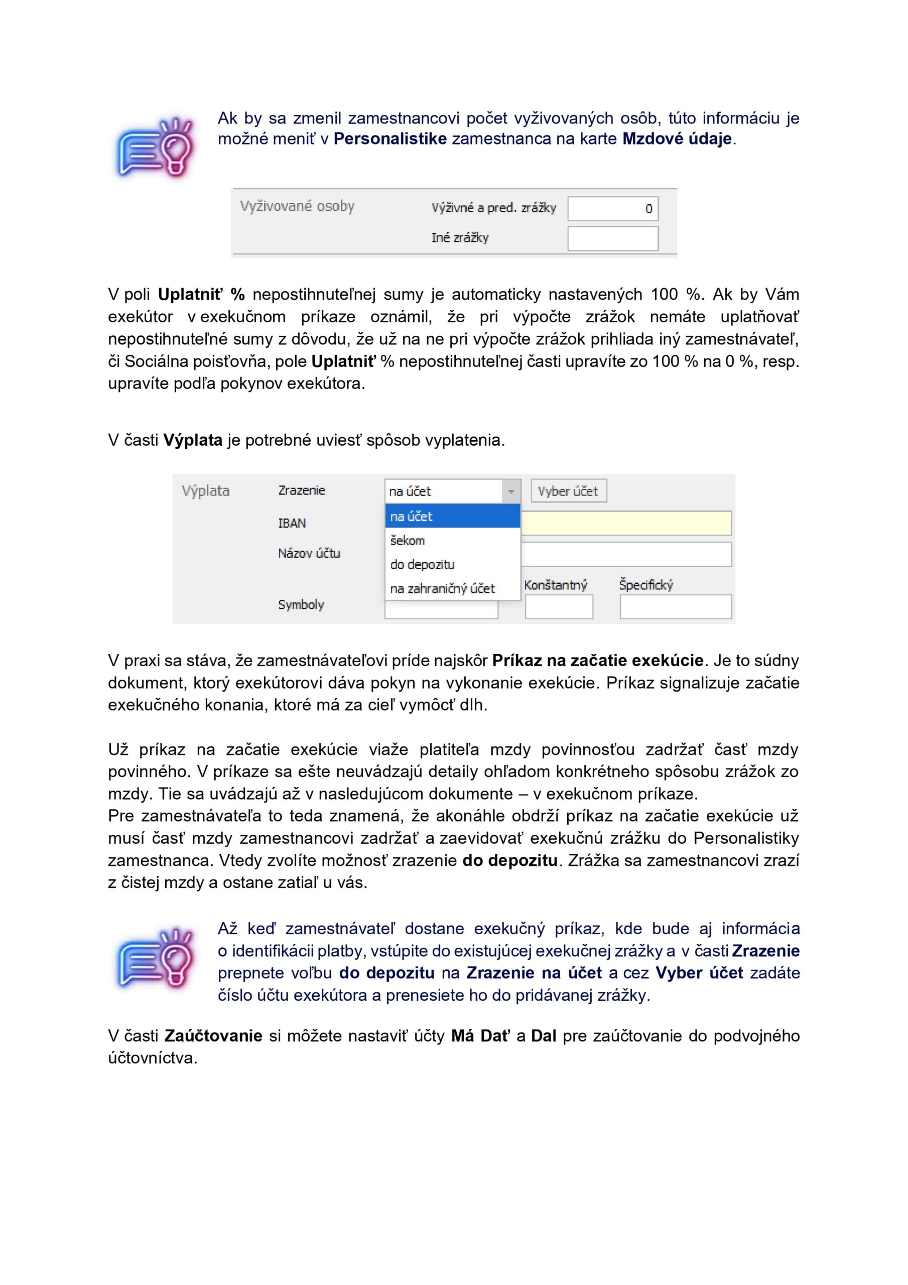 V e-booku Exekučné zrážky sa zoznámite s komplexnou legislatívou týkajúcou sa exekučných zrážok. Vysvetlíme si rozdiel medzi jednotlivými exekučnými zrážkami, ich vplyvom na výpočet mzdy a špecifikami pri zadávaní. Prejdete si celým procesom exekučných zrážok – od prvotného oznámenia zamestnávateľovi, cez evidenciu v programe a výpočty, následnú kontrolu a splatenie pohľadávky.