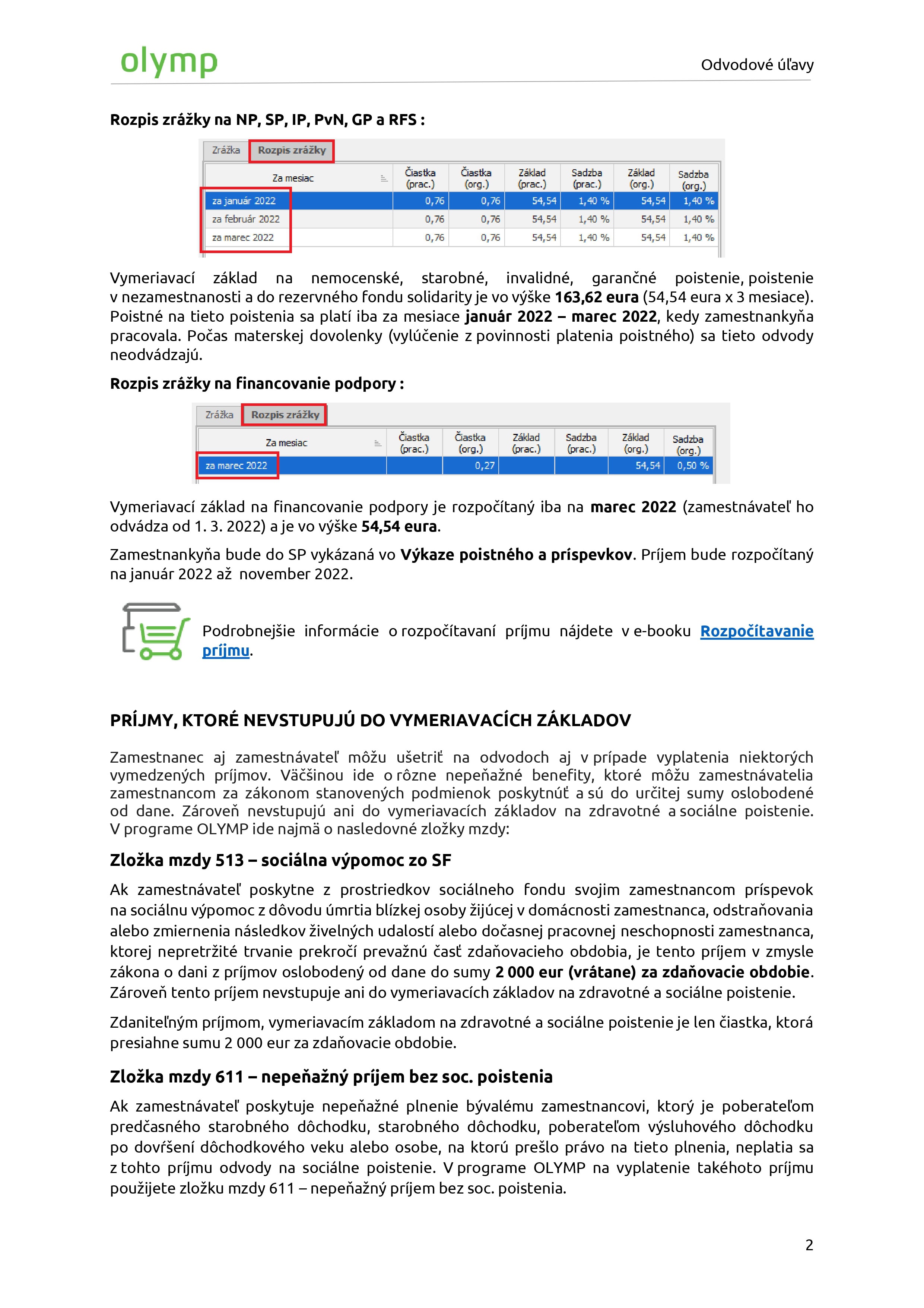 V e-booku sa venujeme odvodovým úľavám, ktoré si zamestnanci uplatňujú. Na zdravotné poistenie si môžu niektorí zamestnanci uplatniť odpočítateľnú položku, ktorá im zníži vymeriavací základ. Iní zo svojho príjmu neodvádzajú poistné na zdravotné poistenie vôbec. Výnimky sú aj na sociálne poistenie, kedy sa poistné z vymeriavacieho základu neodvádza do všetkých poistných fondov.