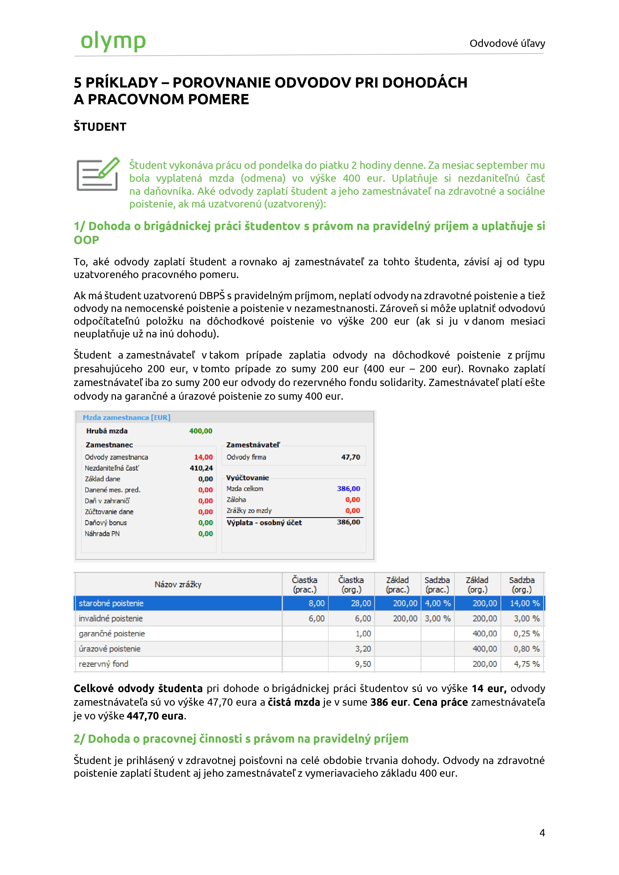 Na príkladoch porovnáme, či sa študentovi alebo poberateľovi dôchodku oplatí uzatvoriť so zamestnávateľom dohodu alebo pracovný pomer, aké odvody pri rovnakej mzde ale rôznych pracovných pomeroch zaplatia a aká je cena práce. V e-booku nájdete aj novinku, a to odpustenie odvodov vybraným zamestnávateľom v poľnohospodárstve a v potravinárskom priemysle.
