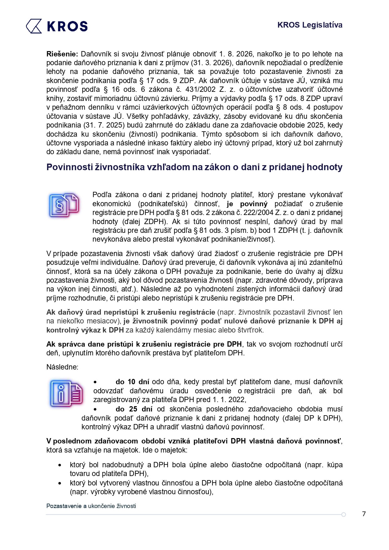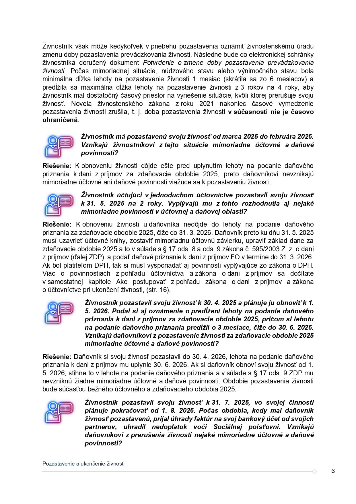 Plánujete pozastaviť alebo ukončiť svoju živnosť? Neviete, aké daňové a účtovné povinnosti sú spojené s týmito úkonmi? V e-booku nájdete informácie, ktoré vám pomôžu zorientovať sa v povinnostiach a zákonných lehotách, na ktoré by ste mali myslieť pri pozastavení, či ukončení živnosti. Taktiež tu nájdete, aké povinnosti a zákonné lehoty musí mať na pamäti právny nástupca v prípade úmrtia živnostníka. V jednotlivých kapitolách sú legislatívne informácie doplnené o praktické príklady. Posledná časť publikácie je venovaná výhodám a nevýhodám podnikania na živnosť a ako s. r. o.