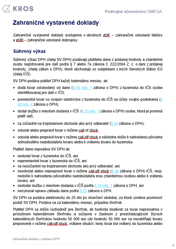 Obchodovanie so zahraničnými partnermi dnes už nie je ničím výnimočné. Je však rozdiel či ide o obchod v rámci EÚ alebo obchodujete s tretími krajinami. Všetko o zahraničných dokladoch s DPH sme pre vás zhrnuli do nového e-booku. Prečítajte si, čo je to súhrnný výkaz a kedy sme povinní ho podávať, ako správne vystaviť zahraničné faktúry a ako sa popasovať s poskytnutými službami, čo s faktúrou, na ktorej máme vyčíslenú DPH iného členského štátu, ako účtovať colné doklady a zahraničné preddavky a veľa iného.